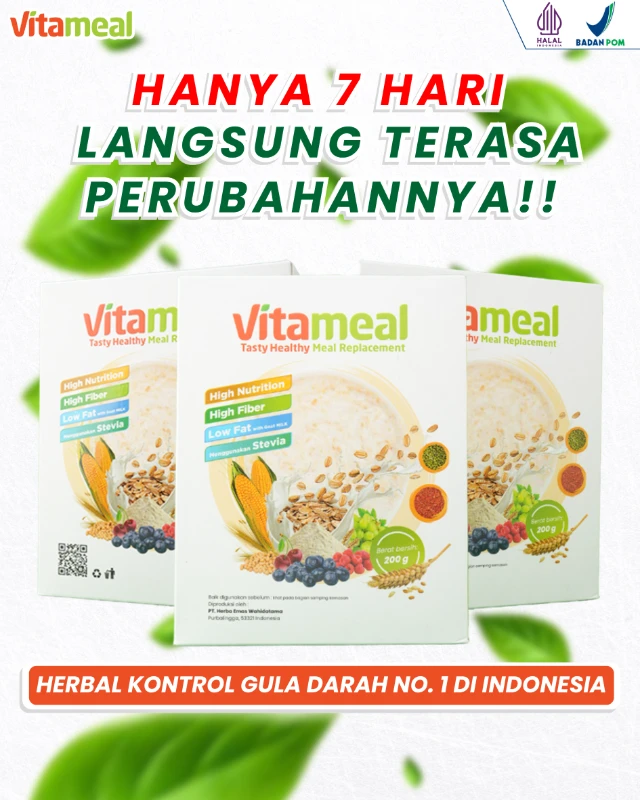 Vitameal, sereal herbal hasil rancangan klinis yang sudah teruji mampu turunkan gula darah dan mengatasi permasalahan yang disebabkan gula darah tinggi & diabetes.